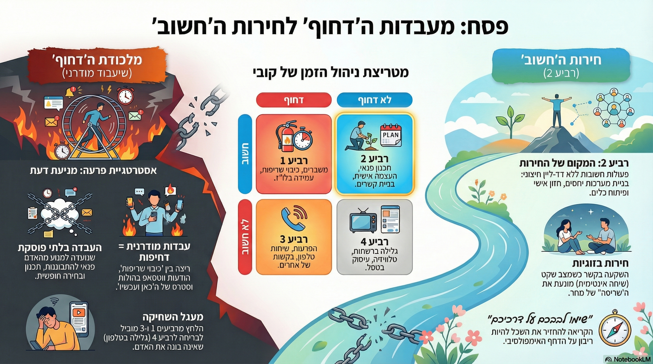 העבדות של ימינו היא הריצה המטורפת בין רביע 1 (כיבוי שריפות) לרביע 3 (הפרעות דחופות), כשאנחנו נדחקים ונשחקים שם, אנחנו בורחים לרביע 4 (גלילה בטלפון) כדי "לנוח", אבל זו מנוחה שלרוב אינה בונה - רביע 2 הוא החירות האמיתית - זהו המקום שבו השכל הופך לריבון על הרגש והדחף האימפולסיבי, זה המקום שבו אנחנו "שמים דעת"; בדיוק מה שפרעה ניסה למנוע מאיתנו - פרעה ידע שאם נהיה עסוקים רק בלבנים ובתבן (רביעים 1 ו3), לעולם לא יהיה לנו פנאי לחלום על ארץ מובטחת (רביע 2).